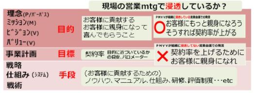 この営業マネージャーが「お客様に親身になること」という「目的」を最上位概念として考えることなく、「契約率」という「目標」が最上位に捉えている発言です。「目的」と「目標」が完全に逆になっています。