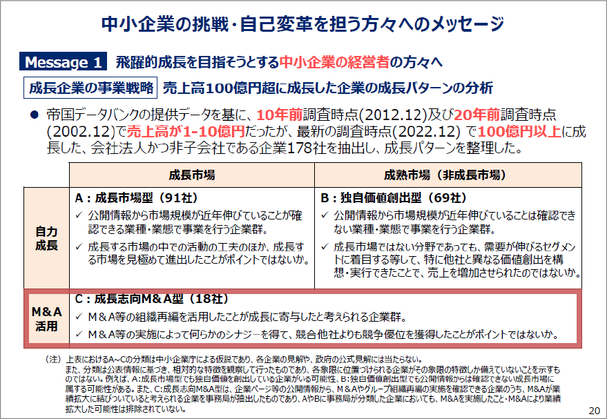 中小企業庁の研究レポートからも、100億企業突破において「M&A活用」は大きな選択肢として紹介されている