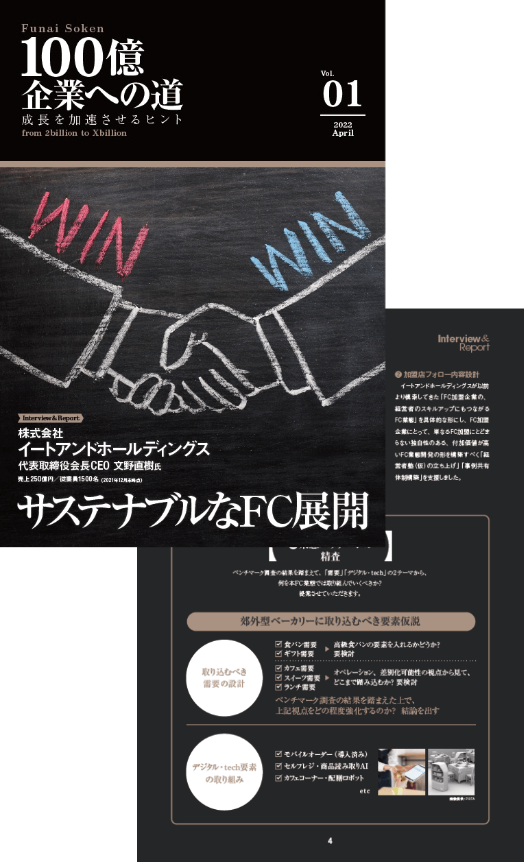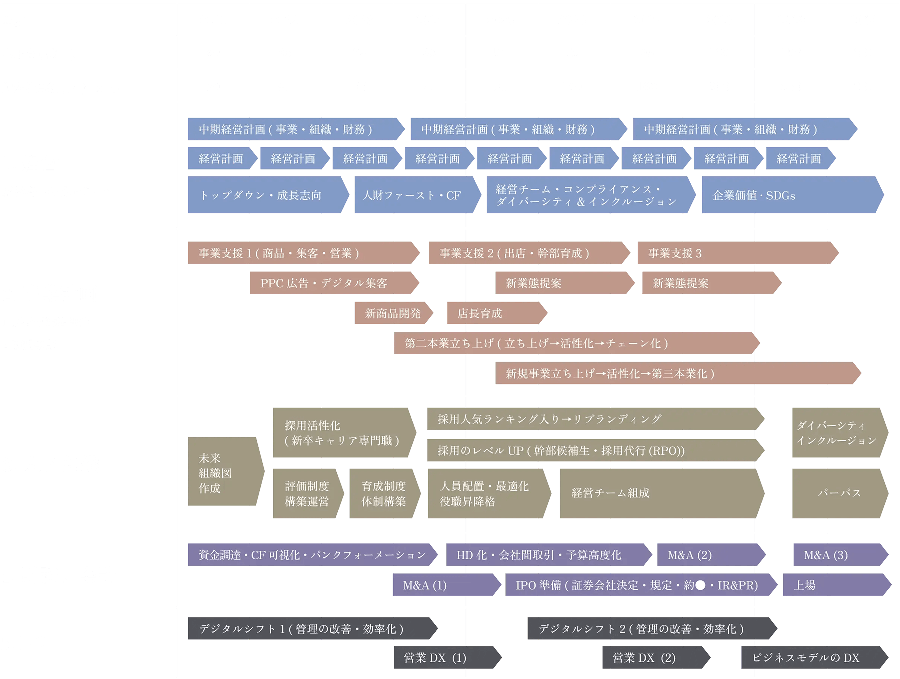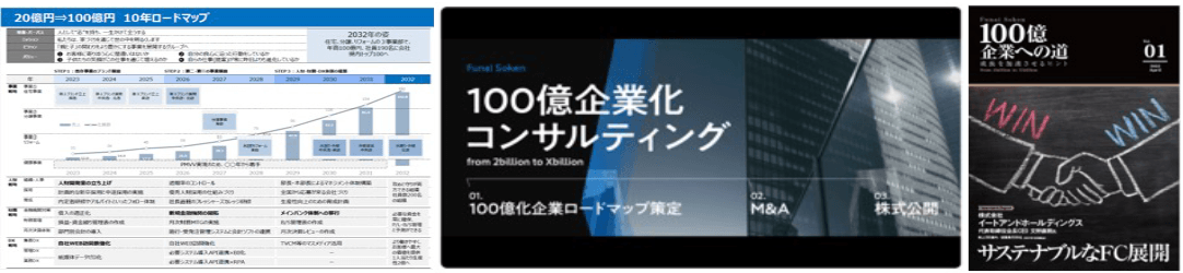 - 100億を達成している企業様のご支援経験、また継続的な100億企業の研究から、100億企業化に必要なノウハウを多数、有しております。