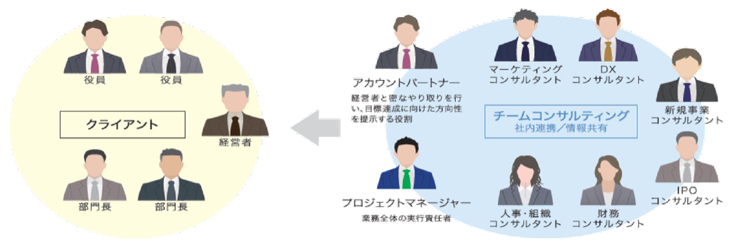 - 船井総研では各機能ごとの専門コンサルタントがチームでワンストップでご支援させていただきます。