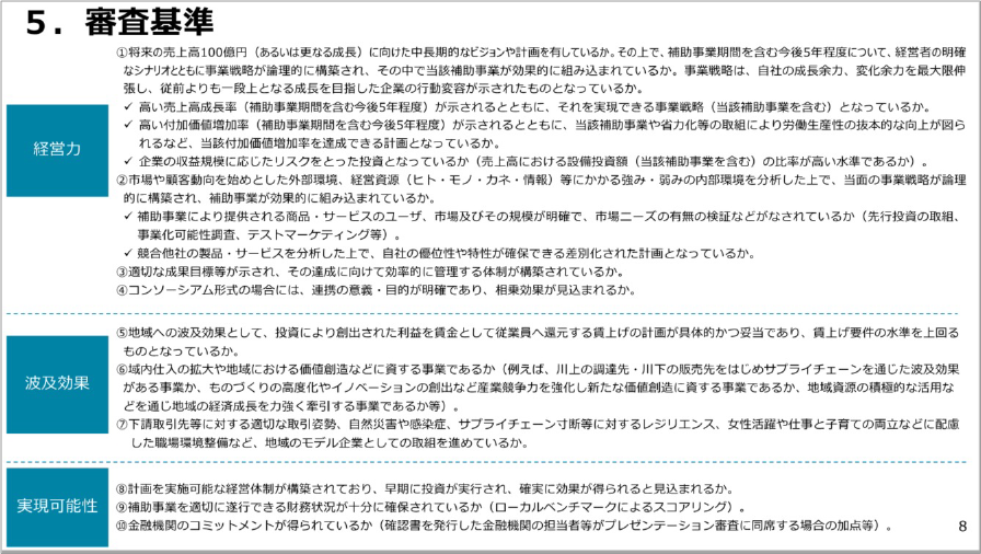 ②補助金の公募の申請時までに補助事業者の100 億宣言が100億宣言ポータルサイトに公表がされていること。なお1次公募においては、補助金の公募の申請と併せて100 億宣言の申請を行うこと ③一定の賃上げ要件を満たす今後5年程度の事業計画を策定すること ④日本国内において補助事業を実施すること ※詳細条件あり。専門家との確認を推奨 |
