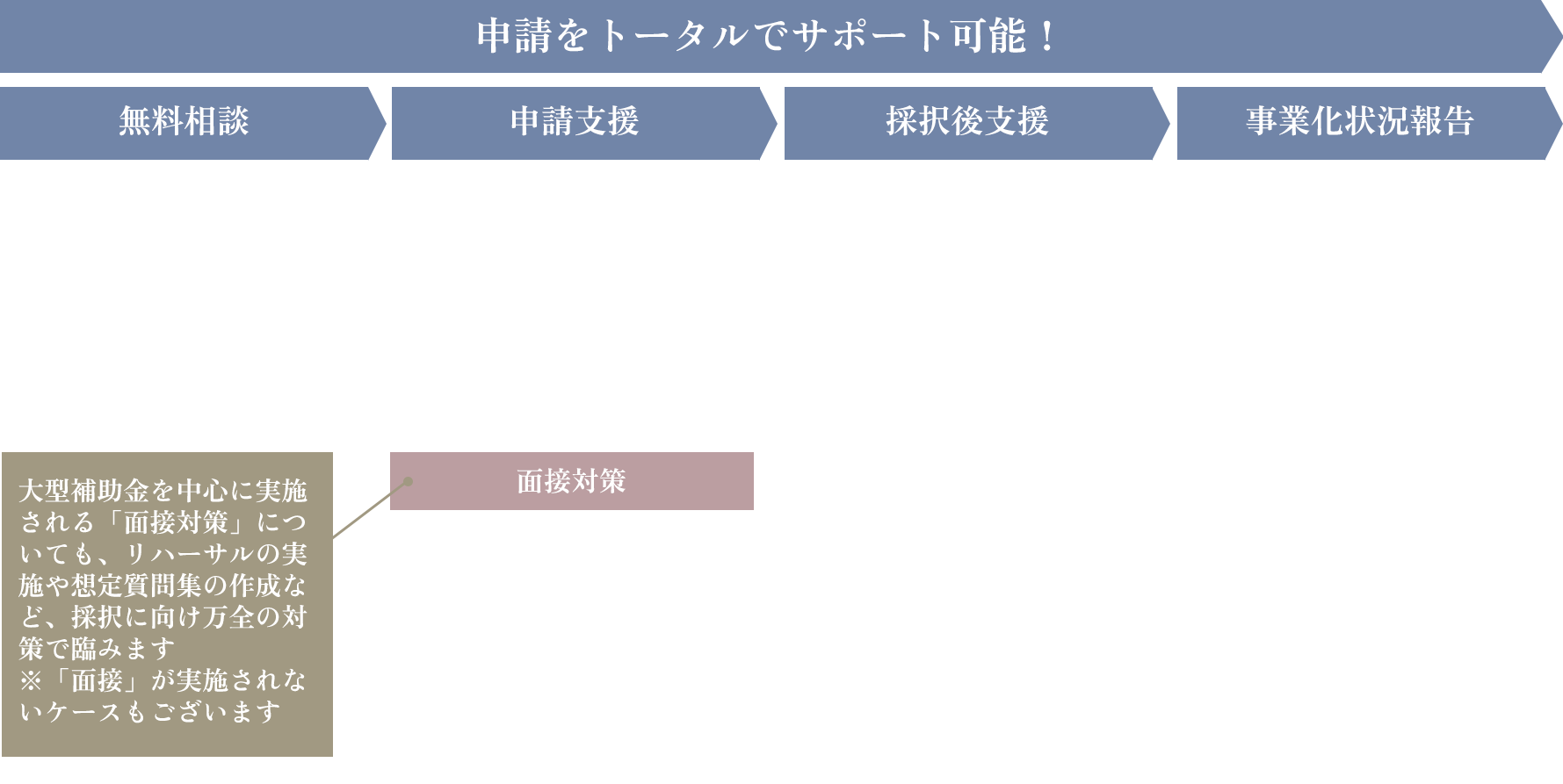 船井総研では、申請支援、採択後支援、事業化報告の作成アドバイスまで
