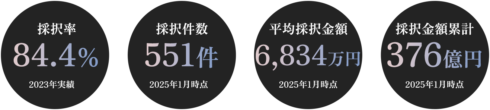 ①平均採択率84.4% 平均獲得金額6,846万円/件・一般的な補助金採択率は40~50%が平均の中、難易度の高い補助金でも8割を超える採択率となっています。